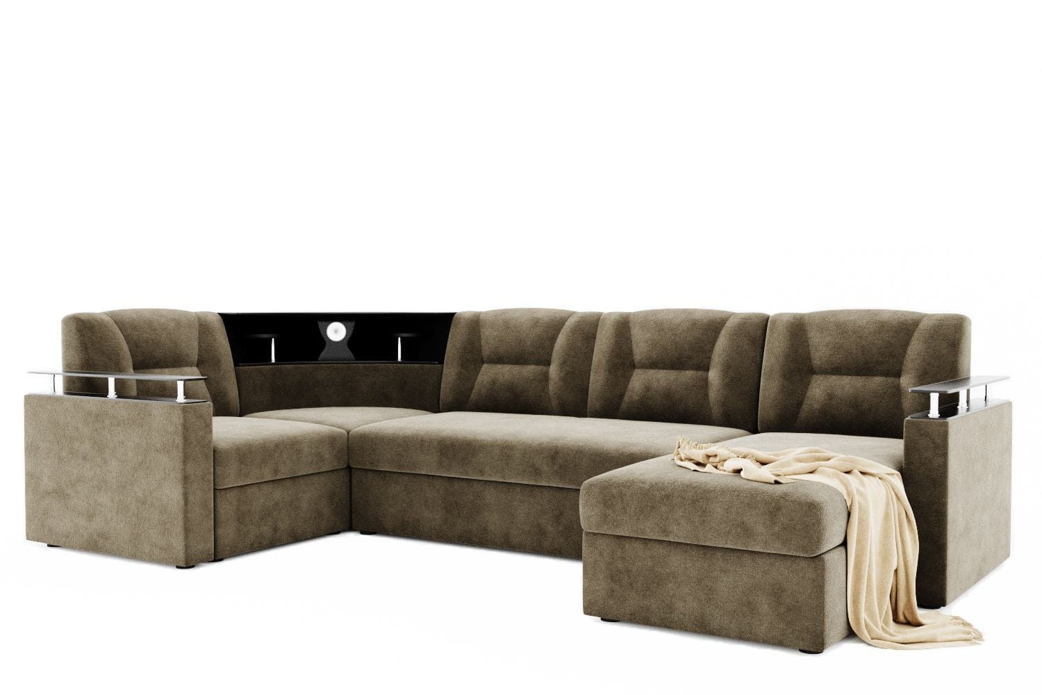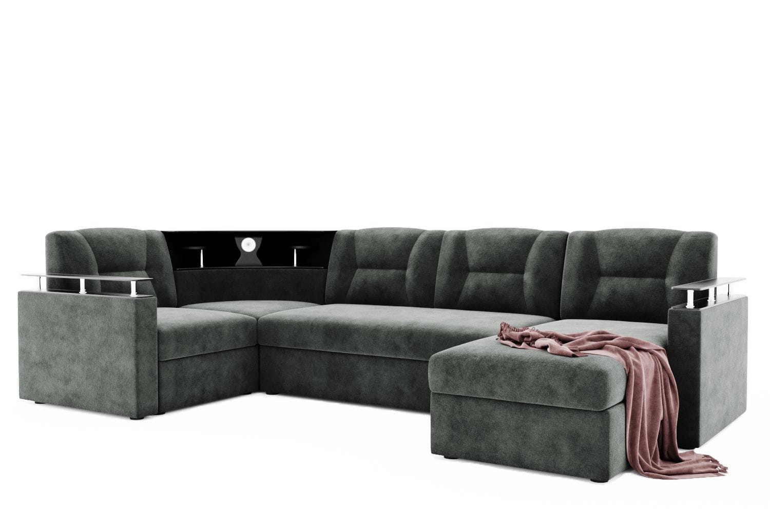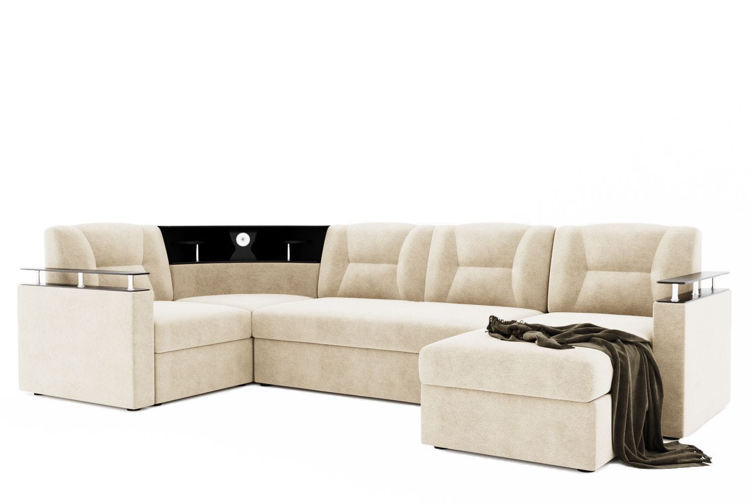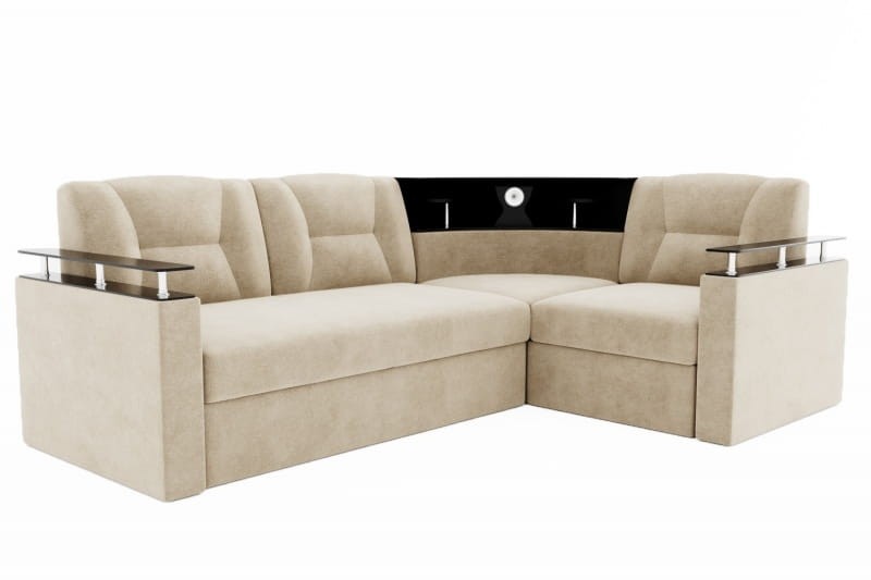 Особенности дивана: Изысканный и стильный трансформер для оригинальных дизайнерских решений! Практичный и вместительный. Барная полка, встроенная в диван. Поможет выгодно зонировать пространство за счёт угловой модели. Имеет встроенную подсветку. Ширина подлокотника - 12 см, длина - 83 см. Высота полки, где находится подсветка: 40 см. Провода для подсветки приобретаются отдельно. Угол дивана универсальный.