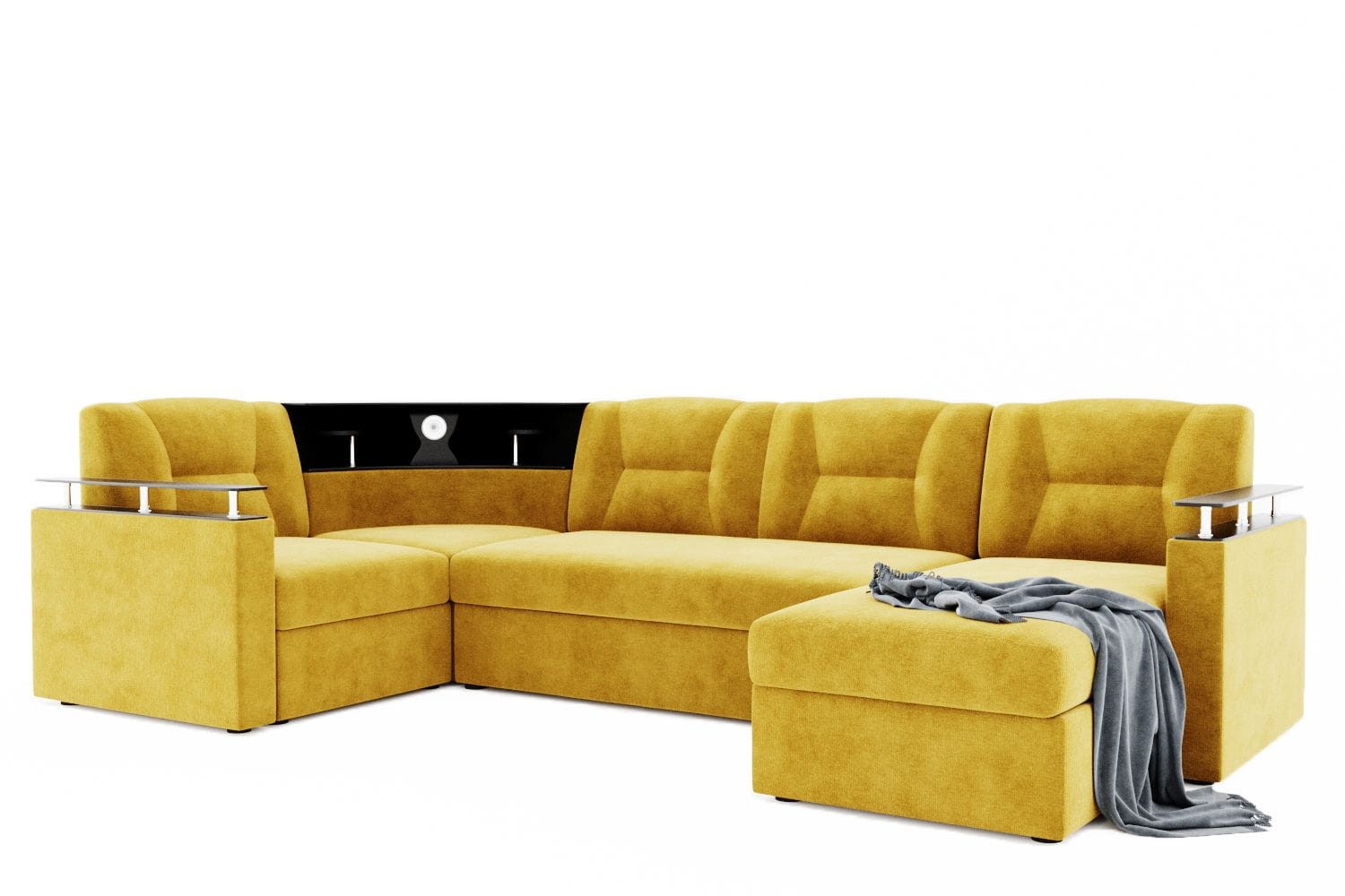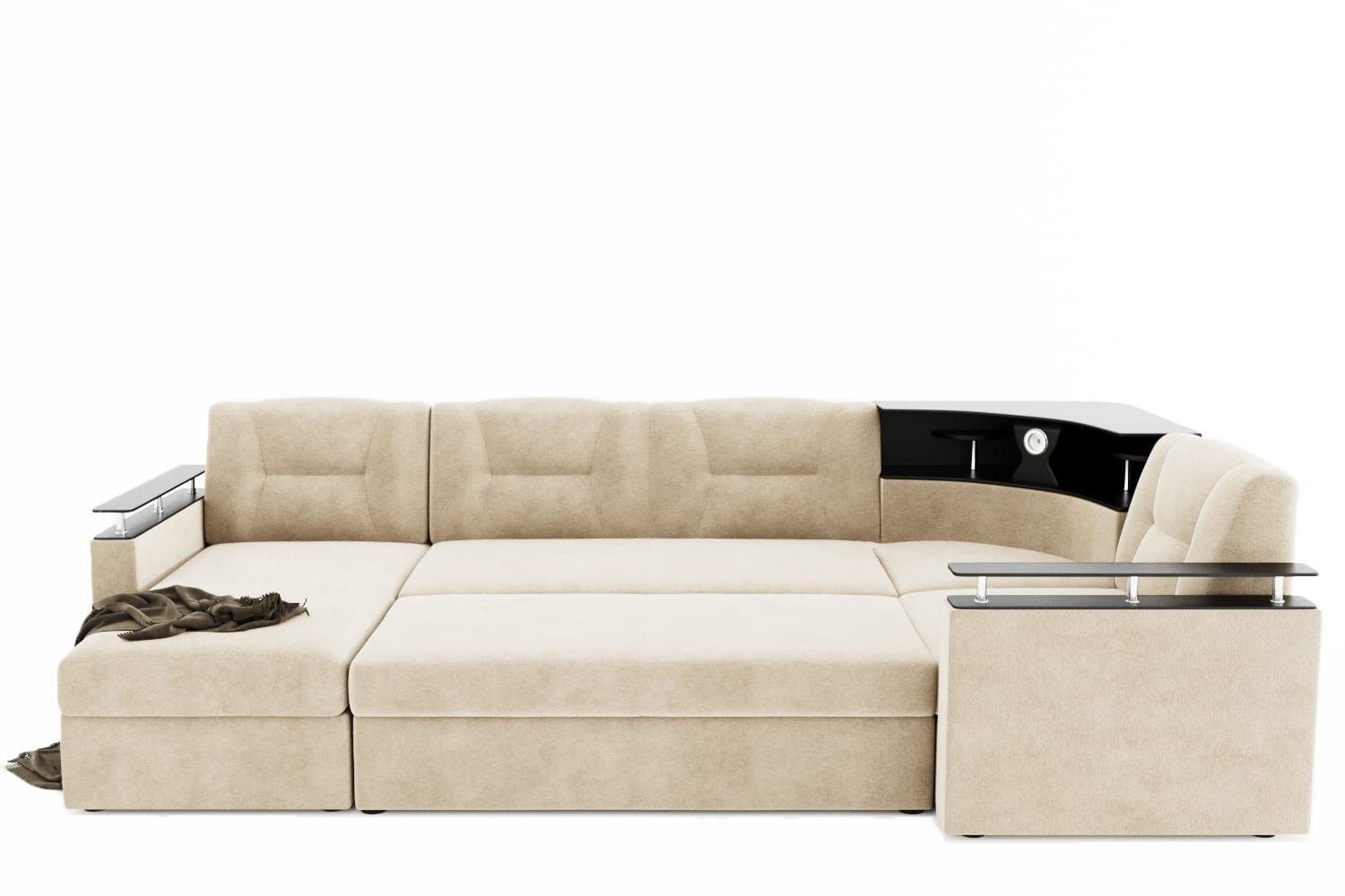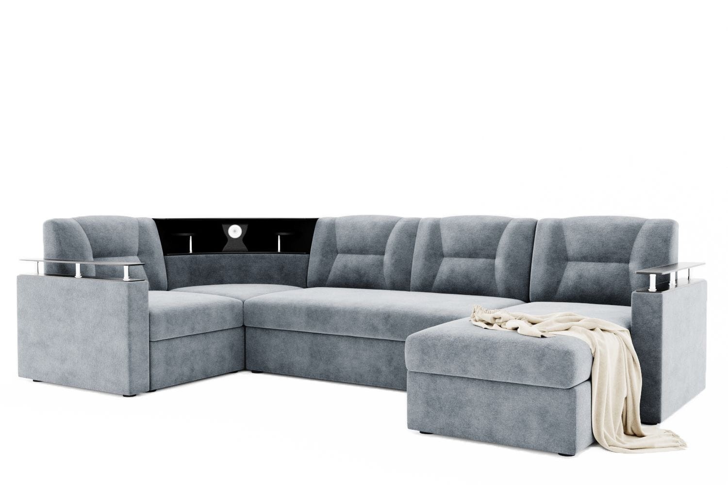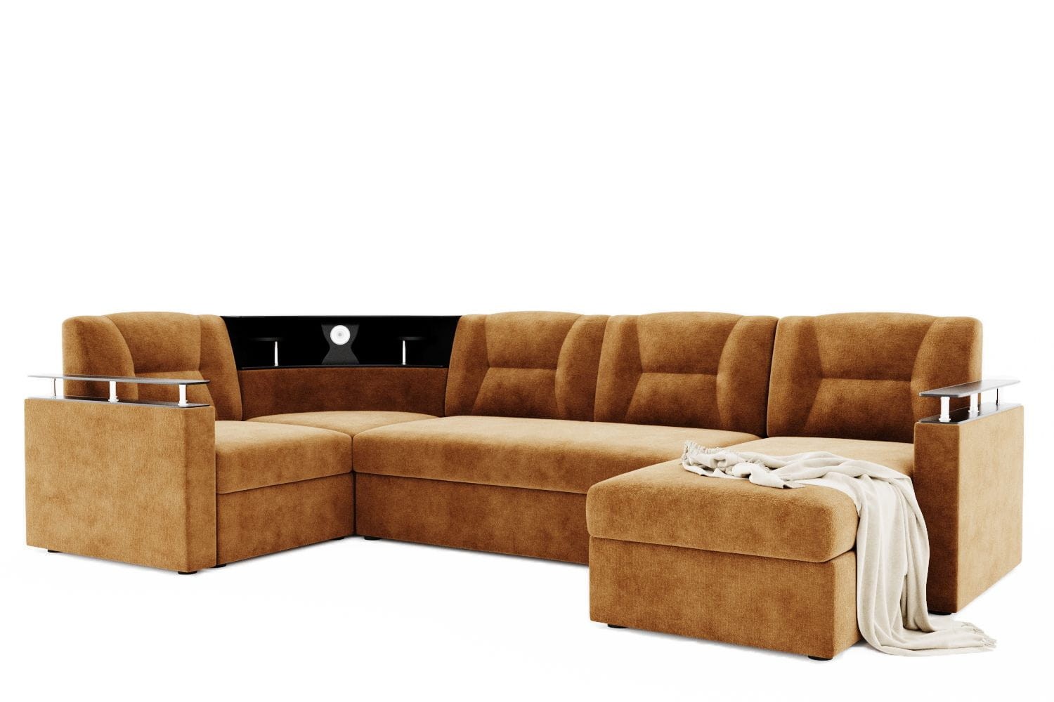 Особенности дивана: Изысканный и стильный трансформер для оригинальных дизайнерских решений! Практичный и вместительный. Барная полка, встроенная в диван. Поможет выгодно зонировать пространство за счёт угловой модели. Имеет встроенную подсветку. Ширина подлокотника - 12 см, длина - 83 см. Высота полки, где находится подсветка: 40 см. Провода для подсветки приобретаются отдельно. Угол дивана универсальный.