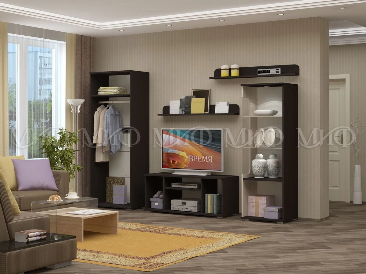 Гостиная "Олеандр" - дизайн гостиной с барной стойкой. Демонстрируемый вариант включает в себя барную секцию, навесные полки, платяной шкаф и тумбу под TV. При наличии свободного места возможно добавление шкафа и пенала. купить недорогую мини гостиную для дома можно при недостатке в квартире свободного пространства.